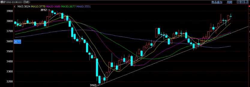 期螺主力RB1810近日已上漲至3800上方,距離前期3912的高點(diǎn)為時(shí)不遠(yuǎn),考慮到近兩周累計(jì)漲幅已達(dá)300點(diǎn),本就有一定技術(shù)性回調(diào)需要,期螺在3900附近必定會(huì)遭遇較強(qiáng)阻力。但從長(zhǎng)期行情看來看,期螺整體仍處于上升態(tài)勢(shì),短期的階段性回調(diào)對(duì)整體行情并無(wú)阻礙,因此可以預(yù)計(jì)后期期螺行情在經(jīng)歷一段回落后7月或仍以震蕩上行態(tài)勢(shì)為主。